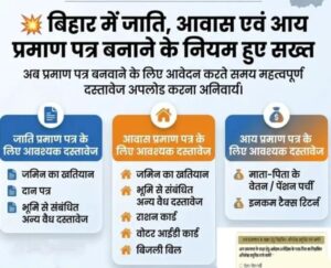 जो जो बिहार सरकार ने आरपीएस पोर्टल के माध्यम से बनने वाले आय प्रमाण पत्र जाति प्रमाण पत्र निवास प्रमाण पत्र के नियम मेंबड़ा बदलाव किया है अब केवल आधार कार्ड से प्रमाण पत्र नहीं बनेगा आवेदन करते समय आवेदन को कई जरूरी दस्तावेज अपलोड करना अनिवार्य कर दिया गया है|