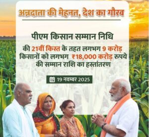 प्रधानमंत्री किसान सम्मन निधि योजना के तहत किसानों को साल में ₹6000 आर्थिक सहायता राशि तीन बार किस्तों में दी जाती हैअब इस योजना के तहत 21वीं किस्त जारी करने को लेकर केंद्र सरकार ने अधिकारी नोटिस जारी की है नोटिस के अनुसार19 नवंबर 2025 को सुबह 11:00 बजे प्रधानमंत्री लाइव कार्यक्रम के दौरानइस किसी का पैसा किसानों के बैंक खाते में ट्रांसफर किया जाएगाबताया जा रहा है कि इस बार 21वीं किस्त में लगभग 9 करोड़ किसानों को18 करोड रुपए की समान निधि राशि भेजी जाएगीइसे अधिक जानकारी प्राप्त करने के लिए आप हमारे इस आर्टिकल पोस्ट में नीचे दिए गए लिंक पर क्लिक करके देखें|